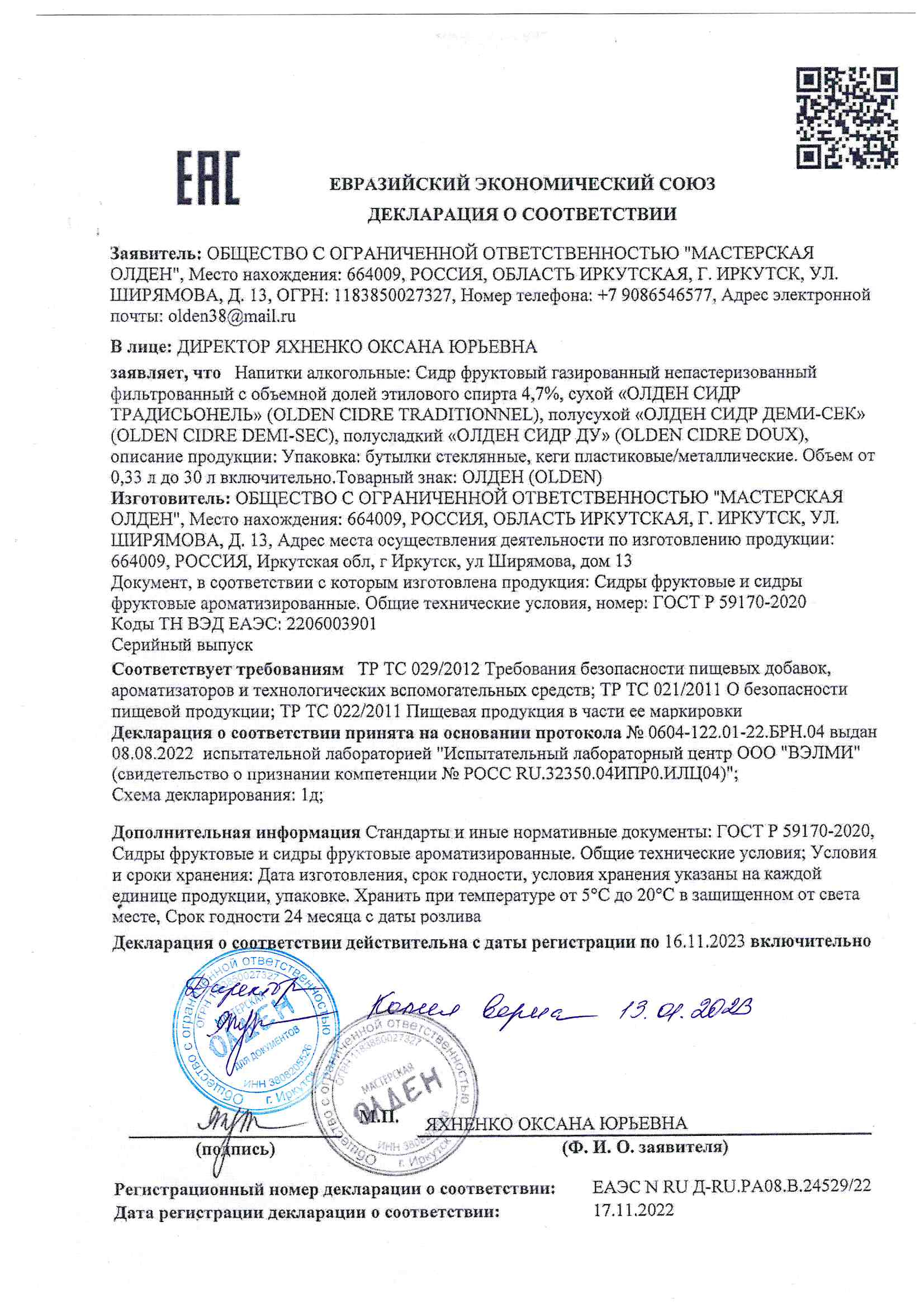 Мастерская olden была основана в 2018 году, в Иркутске. Основная специализация нашей компании заключается в производстве сидра. Благодаря удачному месторасположению, воду для наших напитков мы используем из чистейшего водоёма на планете-озера Байкал. За небольшое время у нашей продукции появилось множество поклонников из разных уголков России. Наше производство Производство сидра —это непростой процесс. Для получения одной тонны сидра требуется две тонны яблок, а срок брожения составляет от 40 до 90 суток. Также, для получения чистого и качественного напитка необходима тщательная фильтрация. 500 000 л. в год. Для производства сидра мы используем надёжное и специализированное оборудование, а также выделяем достаточное место и создаем необходимые условия для правильной выдержки напитков. Благодаря этому, мы производим до 500 000 литров сидра в год.