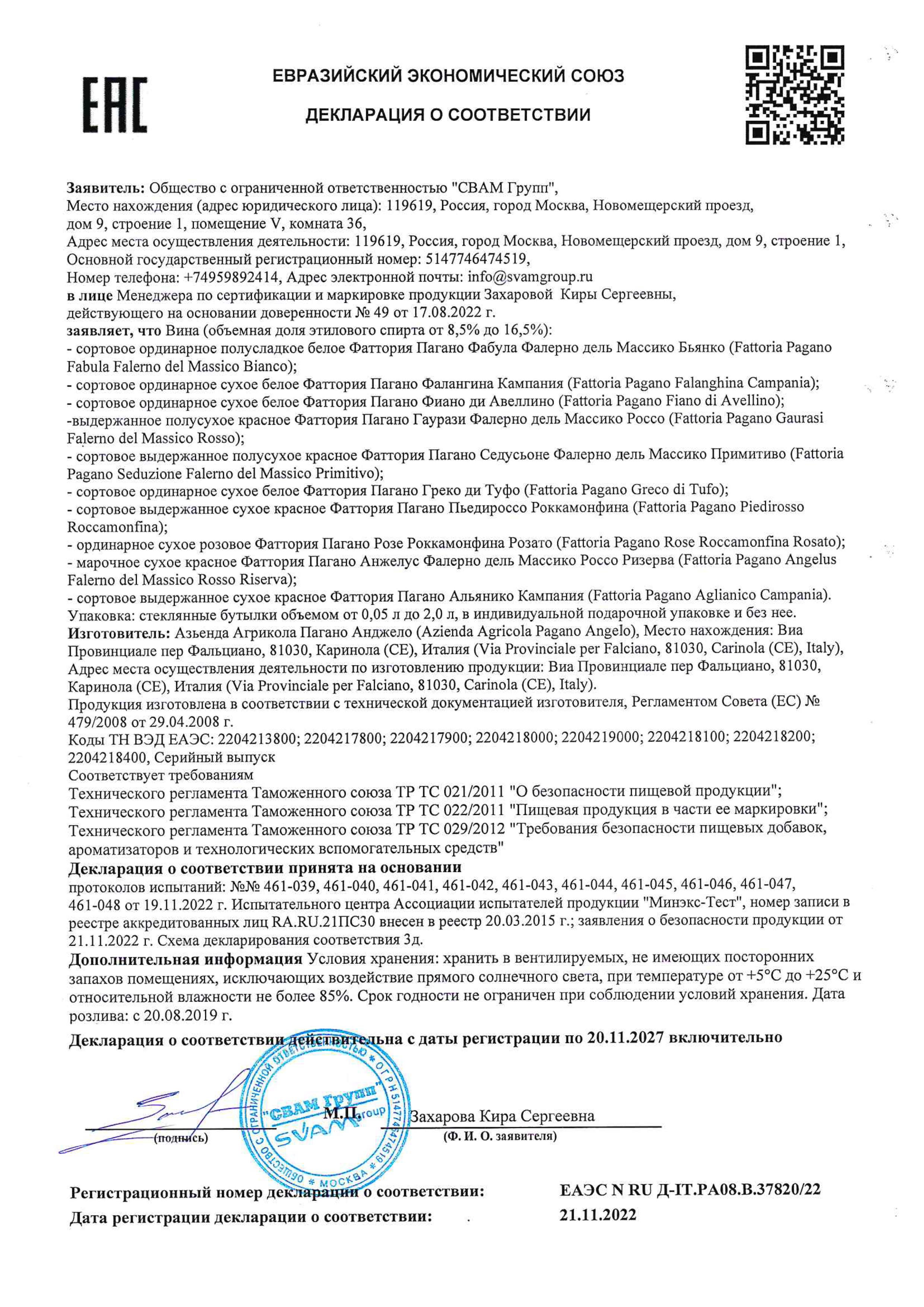 Винодельня Fattoria Pagano родилась в 2001 году благодаря дальновидной идее Антонио Пагано: сделать Фалерно дель Массико доступным для всего мира. Мало кто знает, что Фалерно дель Массико является потомком знаменитого римского вина Фалернум, которое считалось одним из лучших красных вин всех времен и народов, императоров и патрициев Рима. Однако, несмотря на его необычайную славу в древние времена, с упадком Римской империи следы этого мифического вина были утеряны. Антонио ‒ один из пионеров этого проекта, продиктованного исключительно любовью к своей земле.